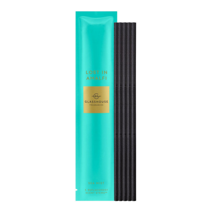 What are the benefits and features of Glasshouse LOST IN AMALFI Replacement Scent Stems x5?- Set of 5 scent scene refills.