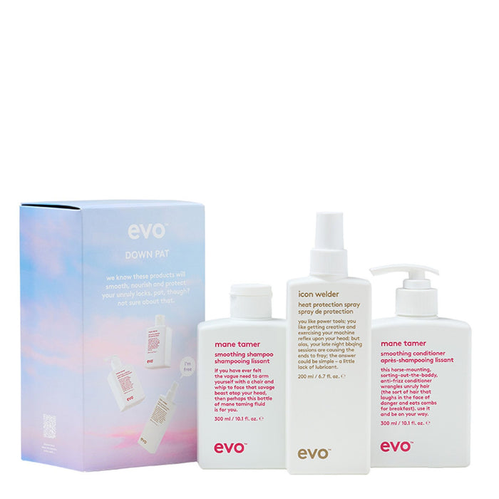 The Evo Down Pat - Smooth is a comprehensive hair care set designed to tame and smooth unruly hair.