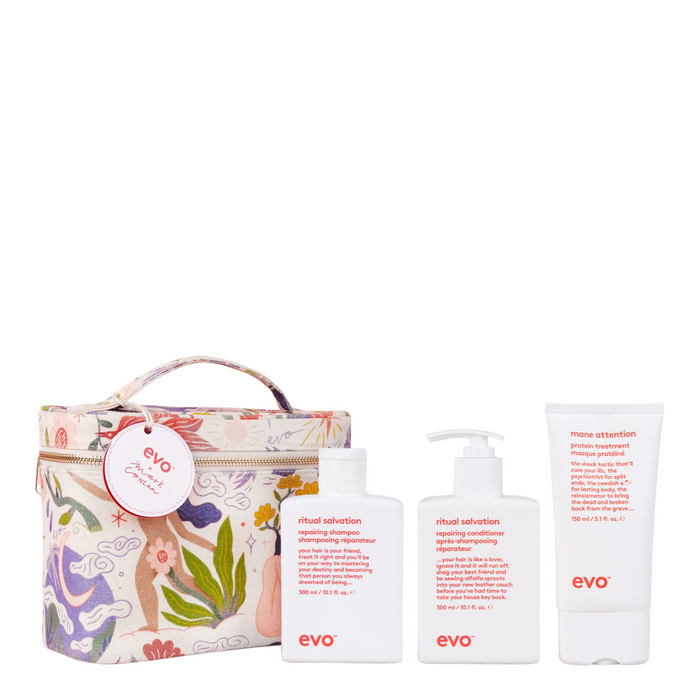 This comprehensive hair care set is designed to restore and rejuvenate your locks, providing essential nourishment and strength. The evo Wonderlocks Repair Trio Pack includes a repairing shampoo and conditioner duo that works in harmony to cleanse and condition your hair, while the protein treatment offers an intensive repair boost. Packaged in a stylish limited edition bag, this trio is perfect for those seeking to transform their hair care routine with professional-grade products.