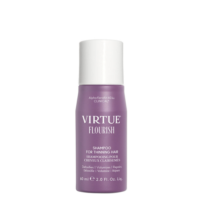 What are the benefits and features of Virtue Flourish Shampoo For Thinning Hair 60ml?- Detoxifies and volumizes hair.