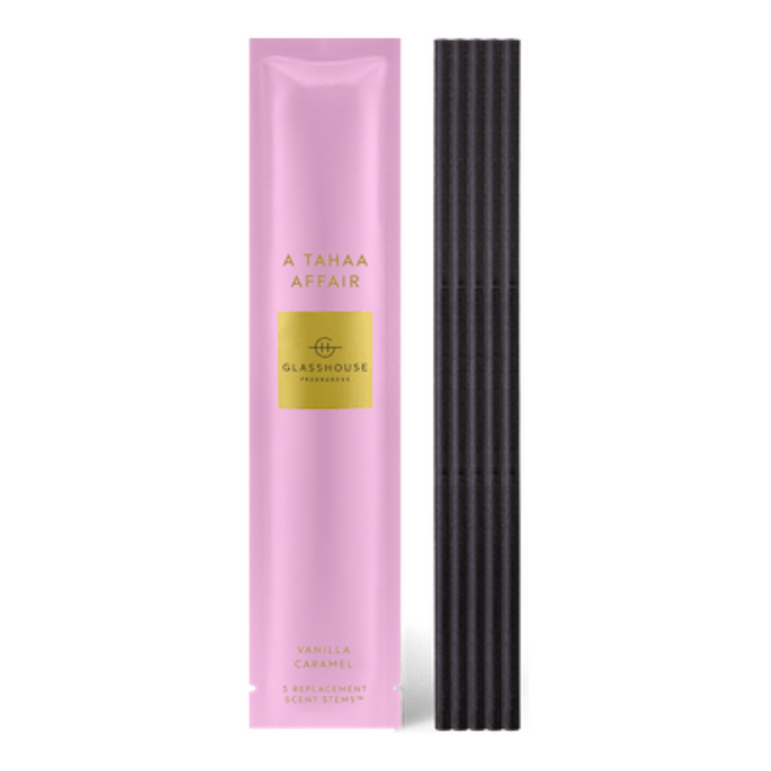 Glasshouse A TAHAA AFFAIR Replacement Scent Stems x5 is a set of five scent scene refills that feature a heavenly caramel and coconut fragrance, taking you to the beaches of Tahaa.