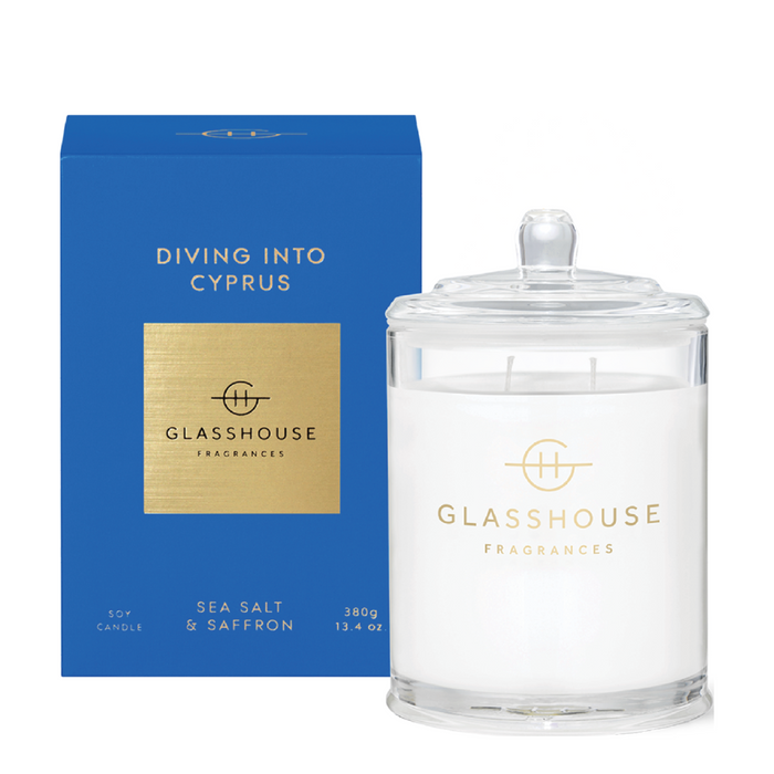 Glasshouse DIVING INTO CYPRUS Candle 380g is a luxurious candle that creates an instant ambience with its bracing scent of sea salt and saffron, balanced by woods, lavender, and moss.