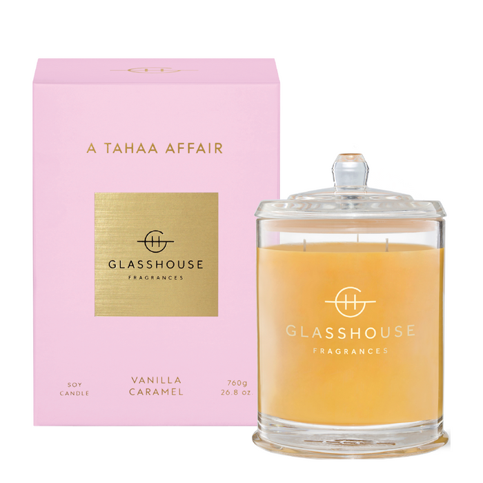 Glasshouse Fragrances A TAHAA AFFAIR Candle 760g is a triple scented candle with a vanilla caramel fragrance that creates a warm and inviting atmosphere in any room.