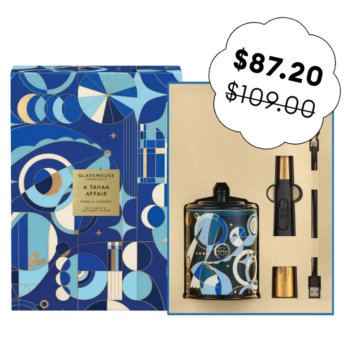 The Glasshouse Fragrances A TAHAA AFFAIR Candle & Care Gift Set is a luxurious collection designed to elevate your home fragrance experience.