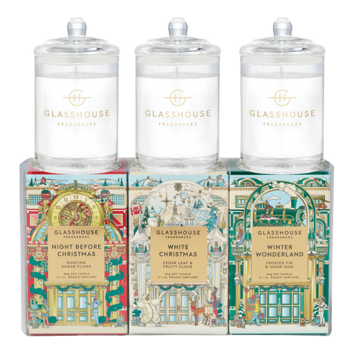 The Glasshouse Fragrances Christmas Trio Gift Set Soy Candle 3x60g is a delightful collection of festive scents perfect for the holiday season.
