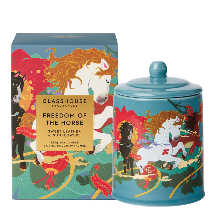 The Glasshouse Fragrances FREEDOM OF THE HORSE Candle 380g is a captivating and adventurous scent experience.