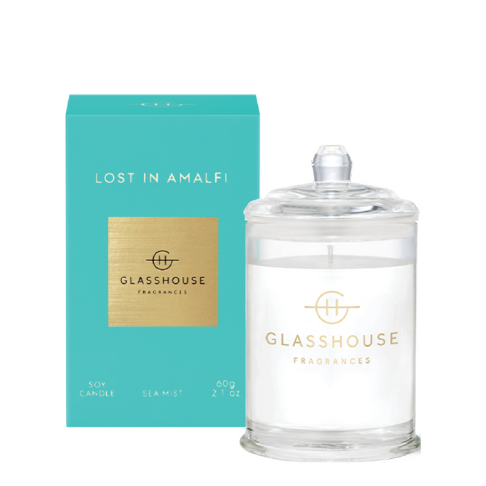 What are the benefits and features of Glasshouse LOST IN AMALFI Candle 60g?- Travel-sized mini candle perfect for a portable sensory escape.
