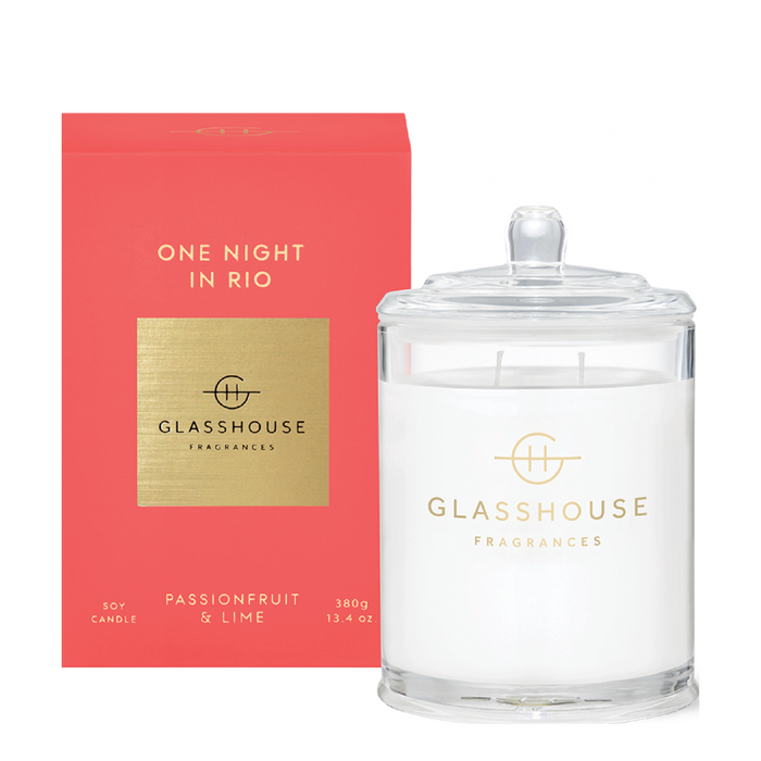 What are the benefits and features of Glasshouse ONE NIGHT IN RIO Candle 380g?- Creates an instant ambience with its effervescent passionfruit and lime scent.