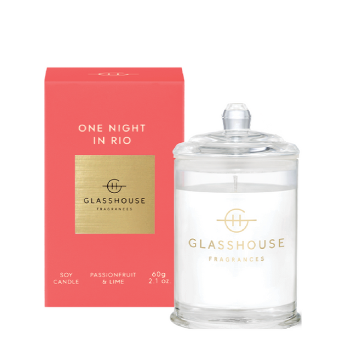 What are the benefits and features of Glasshouse ONE NIGHT IN RIO Candle 60g?- Effervescent passionfruit and lime top notes.