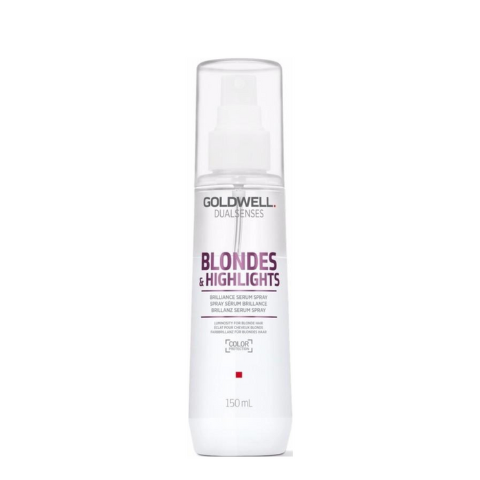 Goldwell Dualsenses Blondes & Highlights Brilliance Serum Spray 150ml is a leave-in spray designed for blonde and highlighted hair that provides instant combability and creates a new color shine, with added heat protection.