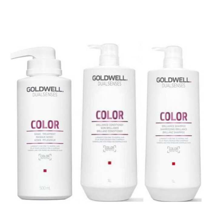 Goldwell Dualsenses Color Brilliance Big Bottle Trio Bundle includes a shampoo, conditioner, and treatment that bring out color luminosity and provide nourishing care for colored and non-colored hair.