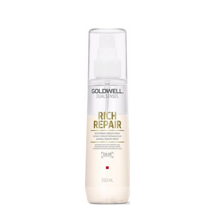 Goldwell Dualsenses Rich Repair Restoring Serum Spray 150ml instantly reconstructs damaged hair, providing suppleness, shine, and heat protection.