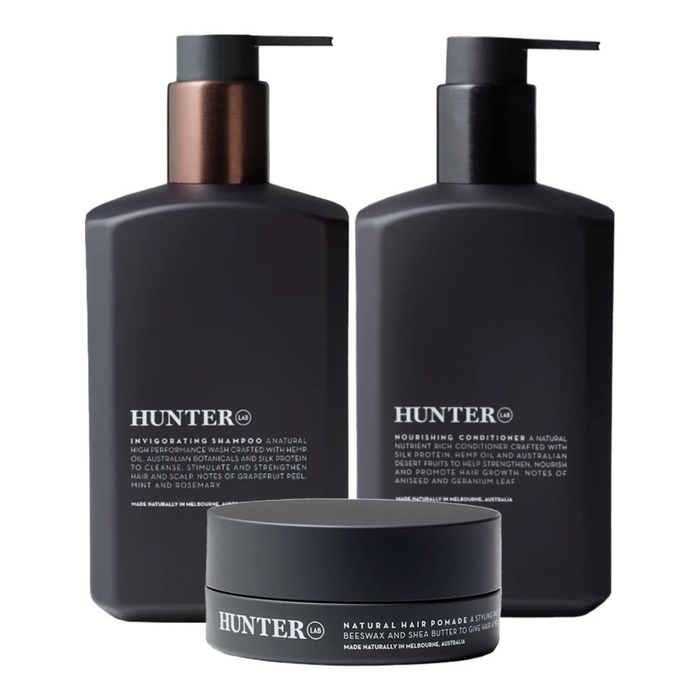 This premium bundle combines the best of Hunter Lab's hair care products to provide a comprehensive solution for cleansing, conditioning, and styling your hair. Crafted with natural ingredients, each product in the bundle is formulated to nourish and protect your hair, leaving it healthy and manageable. Whether you're looking to refresh your hair with a deep cleanse, hydrate and strengthen it, or achieve a polished look with a natural finish, this bundle has you covered.