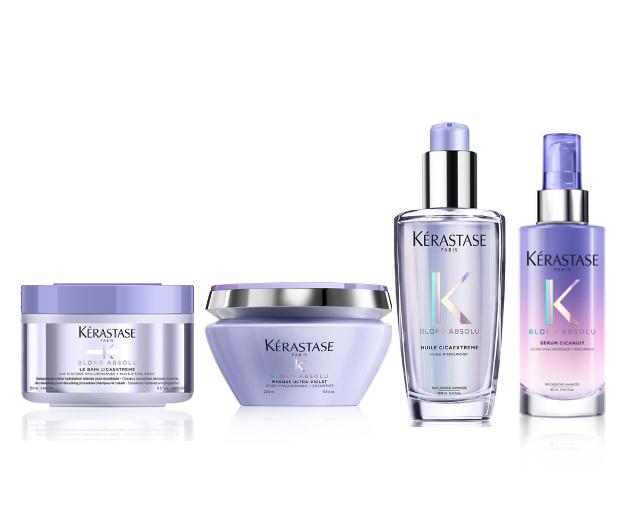 The Kérastase Blond Absolu Lightening Addict Bundle is a complete haircare package that includes a shampoo, mask, oil, and serum to nourish and protect blonde hair.
