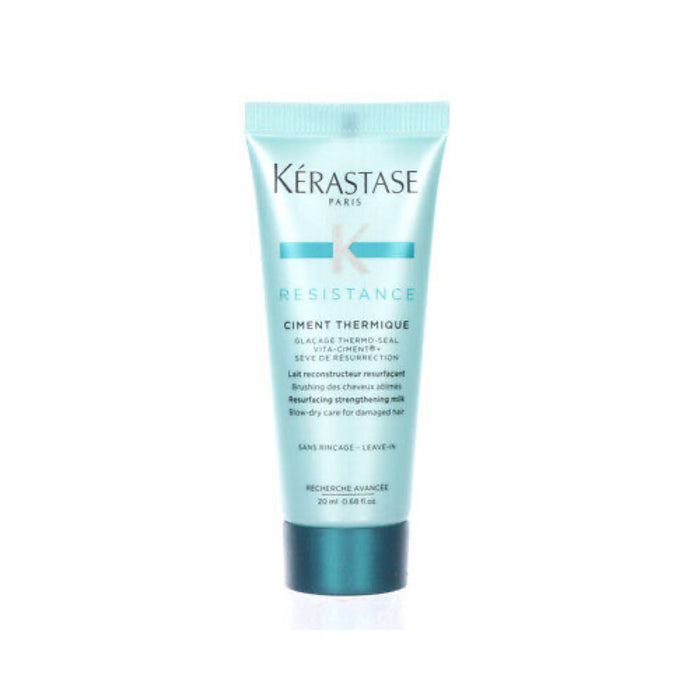 Kérastase Resistance Ciment Thermique Sample 20ml is a reconstructing milk that strengthens and protects hair from heat damage while providing a smooth and shiny finish.