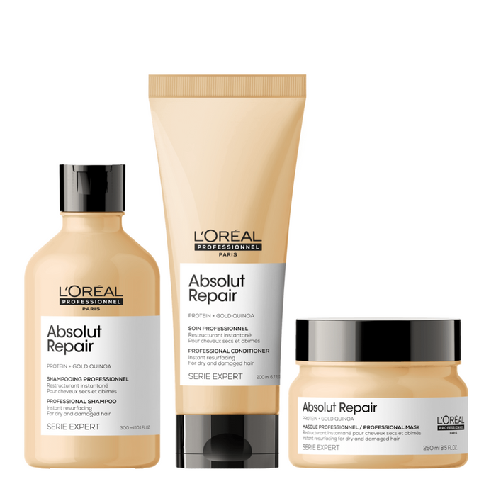 The L'Oréal Professionnel Absolut Repair Bundle includes a shampoo, conditioner, and masque that have been designed to target each part of the hair fiber according to the level of damage, providing the ultimate professional repair experience for damaged and dry hair.