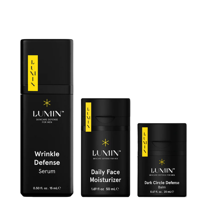 This trio includes Lumin Daily Face Moisturizer 50ml, Lumin Dark Circle Defense Balm 20ml, and Lumin Wrinkle Defense Serum 15ml. Each product is designed to help you achieve a healthy, glowing complexion.
