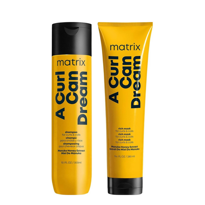 Matrix Total Results Curl Can Dream Shampoo and Mask Bundle includes Matrix A Curl Can Dream Shampoo 300ml and Matrix A Curl Can Dream Rich Mask 280ml, both infused with Manuka honey extract to preserve the pattern of curls and coils.