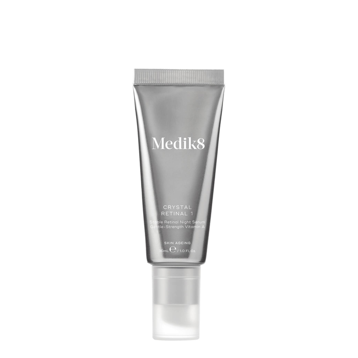 Medik8 Crystal Retinal 1 Night Serum 30ml is a powerful vitamin A serum that visibly minimizes fine lines and wrinkles, firms and plumps the complexion, and resurfaces skin texture to reveal a more youthful-looking complexion.