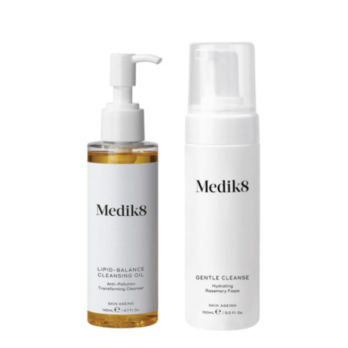 The Medik8 Lipid-Balance Cleansing Oil and Gentle Cleanse Bundle is a two-product set that includes a silky oil cleanser and a rosemary-infused foaming wash to gently remove impurities and leave skin feeling refreshed and hydrated.