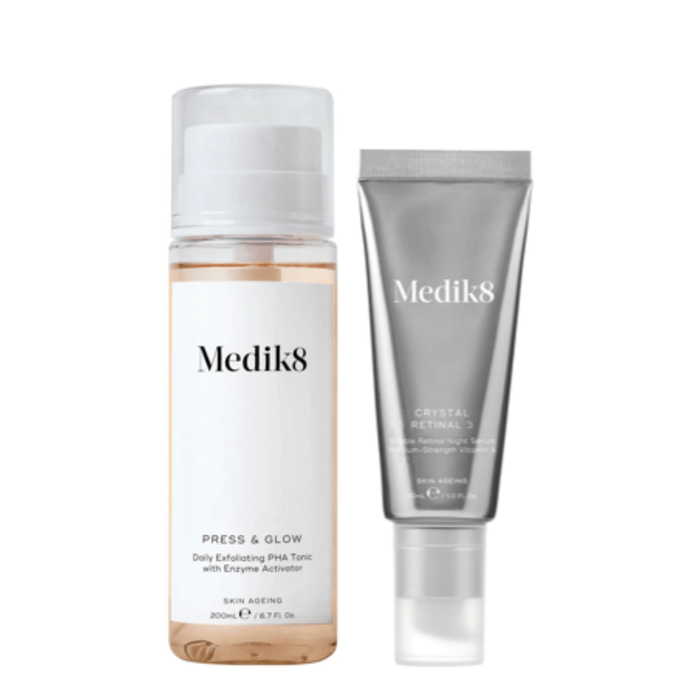 The Medik8 Press & Glow and Crystal Retinal 3 Bundle is a powerful skincare duo that includes a daily exfoliating PHA tonic and a night serum with next-generation anti-aging results.