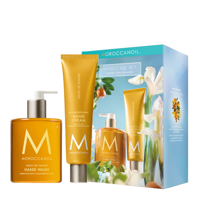 The Moroccanoil Hand Care Set Soleil De Tanger is a luxurious duo designed to cleanse and moisturize your hands with a refreshing citrus scent.