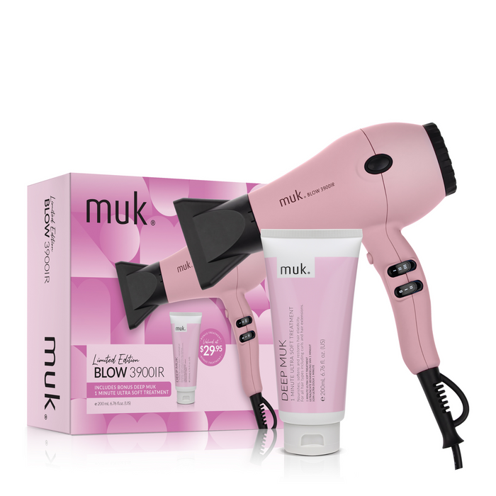 This exclusive pack combines the power of the Muk Limited Edition Pink Blow 3900-IR Hair Dryer with the nourishing Deep muk 1 Minute Treatment. The hair dryer is designed to deliver fast drying with infrared heat technology, reducing damage and enhancing shine. Paired with the Deep muk treatment, which deeply conditions and revitalizes hair in just one minute, this pack ensures your hair looks and feels its best.