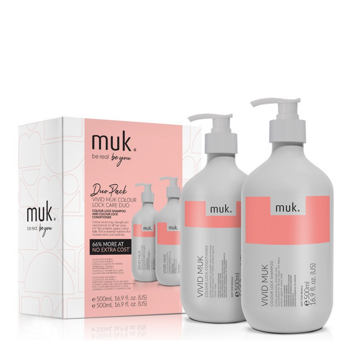Muk Vivid Muk Colour Lock Shampoo and Conditioner 500ml Bundle is a haircare set that includes a lightweight detangling shampoo and a nourishing conditioner that protect hair from fading while adding extra nourishment.