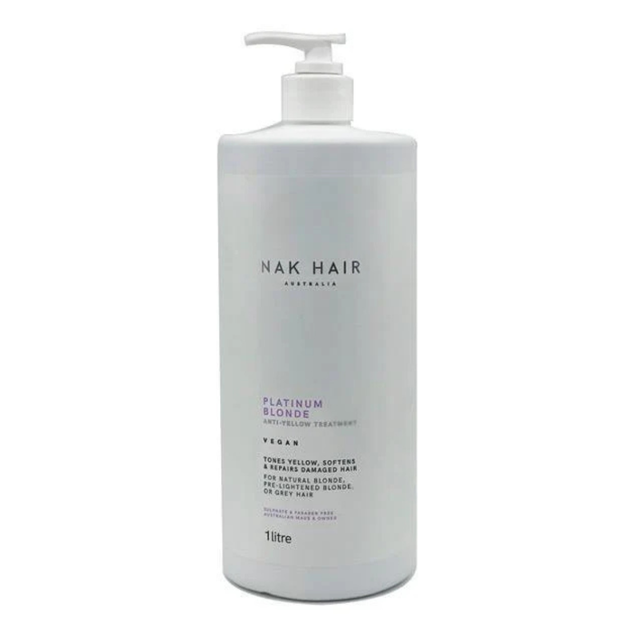 The Nak Platinum Blonde Anti-Yellow Treatment 1000ml (Old Packaging) is a specialized hair treatment designed to neutralize yellow tones in blonde hair.