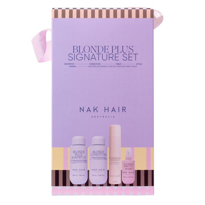 The NAK Signature Holiday Blonde Plus Quad Pack is the ultimate hair care set for maintaining vibrant blonde hair.