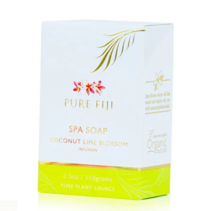 The Pure Fiji Spa Soap - Coconut Lime Blossom 110g is a luxurious soap that invigorates your senses with a tropical fragrance.