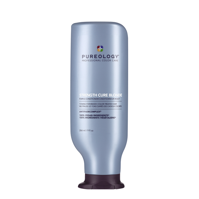 Pureology Strength Cure Blonde Purple Conditioner 266ml is a deeply hydrating concentrated formula that tones and fortifies brassy, damaged, and lightened hair.