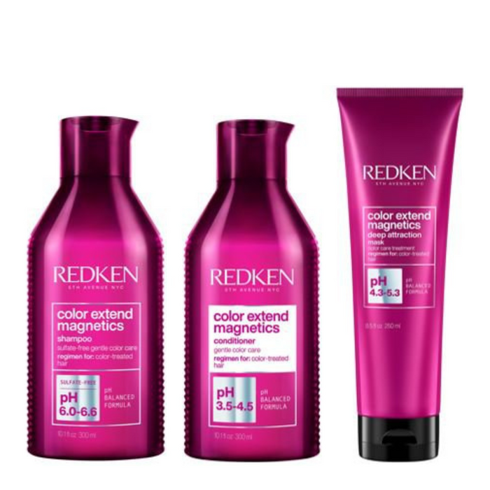 The Redken Color Extend Magnetics Trio Bundle includes Color Extend Magnetics Shampoo, Color Extend Magnetics Conditioner, and Color Extend Magnetics Deep Attraction Mask, all designed to enhance shine and hair color vibrancy while preventing hair color fade.