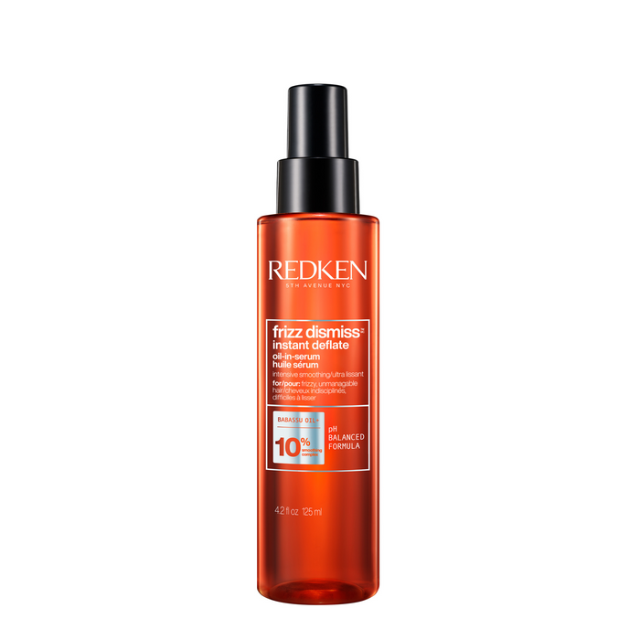 Redken Frizz Dismiss Instant Deflate Oil-In-Serum 125ml is an anti-frizz hair oil-in-serum that helps control excess puffy, frizzy hair caused by humidity, featuring Redken's Smoothing Complex and sustainably sourced babassu oil for increased manageability, smoothness, and shine.