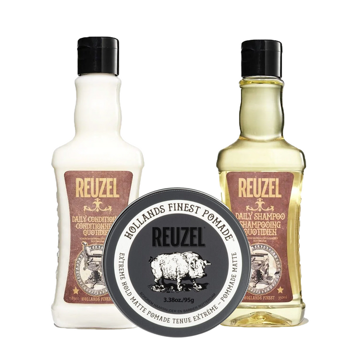 This comprehensive hair bundle includes everything you need for a complete hair care routine, featuring the Reuzel Extreme Hold Matte Pomade for a firm hold and matte look, along with Reuzel Daily Shampoo and Conditioner to keep your hair clean and nourished. Perfect for those who want to maintain a stylish and well-groomed appearance, this bundle offers high-quality products that deliver professional results at home.
