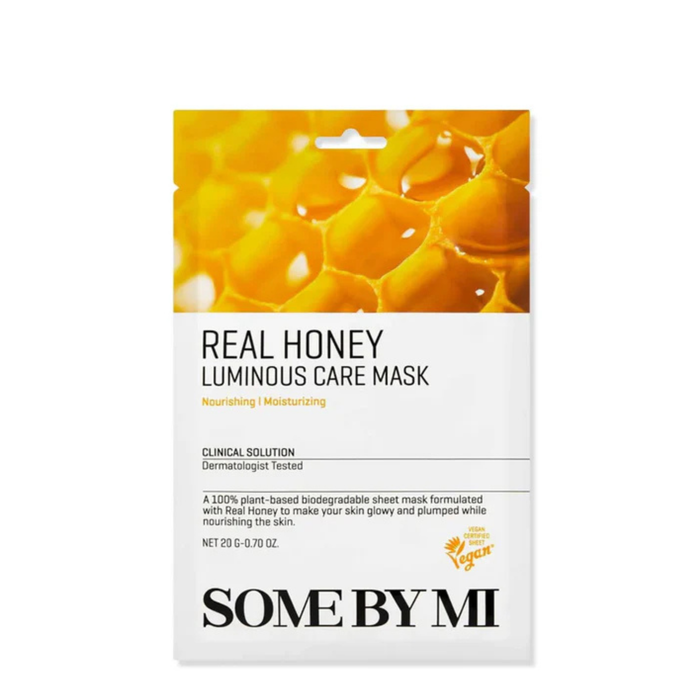 The Some By Mi Real Care Real Honey Luminous Care Mask is a nourishing face mask designed to enhance skin radiance.