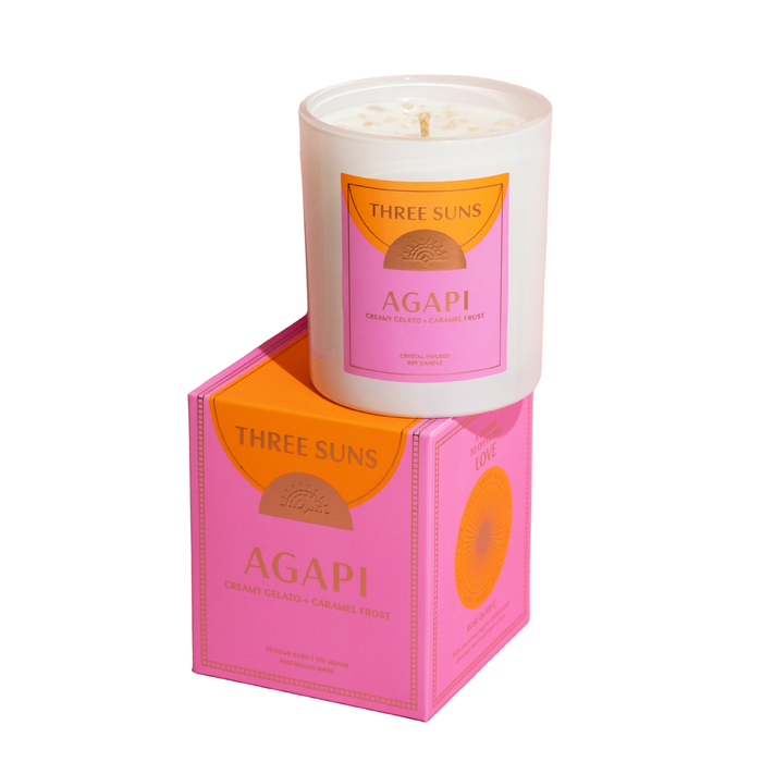 Experience the enchanting aroma of the Three Suns Agapi Crystal Infused Candle Of Love 300g - Creamy Gelato & Caramel Frost.