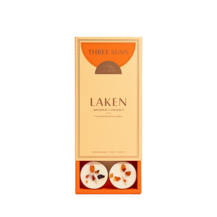 Experience tranquility with the Three Suns Laken Crystal Infused Natural Soy Tea Lights Box - 8 Pack.