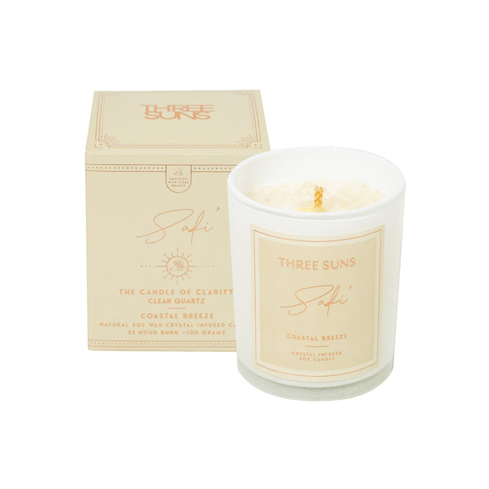 Experience tranquility with the Three Suns Safi Crystal Infused Candle Of Clarity 100g - Coastal Breeze.