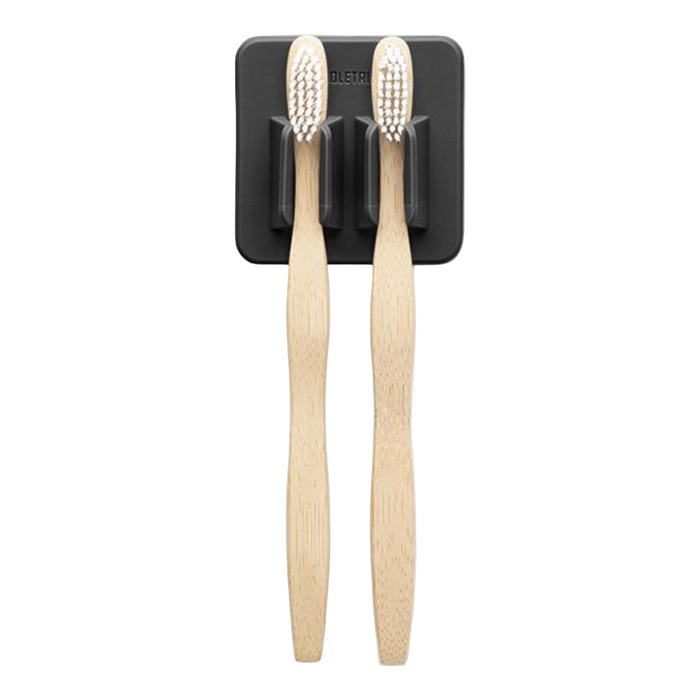 Tooletries The George Toothbrush Rack - Charcoal is a twin-toothbrush-design toothbrush rack that can be easily stuck to any shiny surface and removed, cleaned, and reused.