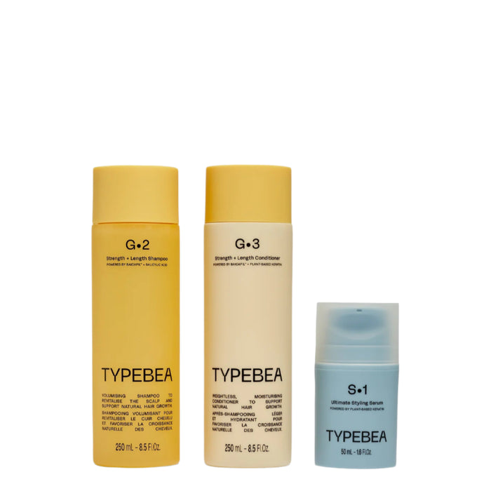 This bundle combines the power of cleansing, conditioning, and styling to give you salon-quality results at home. The TYPEBEA Cleanse + Smooth Style Bundle includes a shampoo and conditioner designed to strengthen and lengthen your hair, along with a styling serum that provides the ultimate finish. Perfect for those looking to maintain healthy hair while achieving a smooth, styled look.