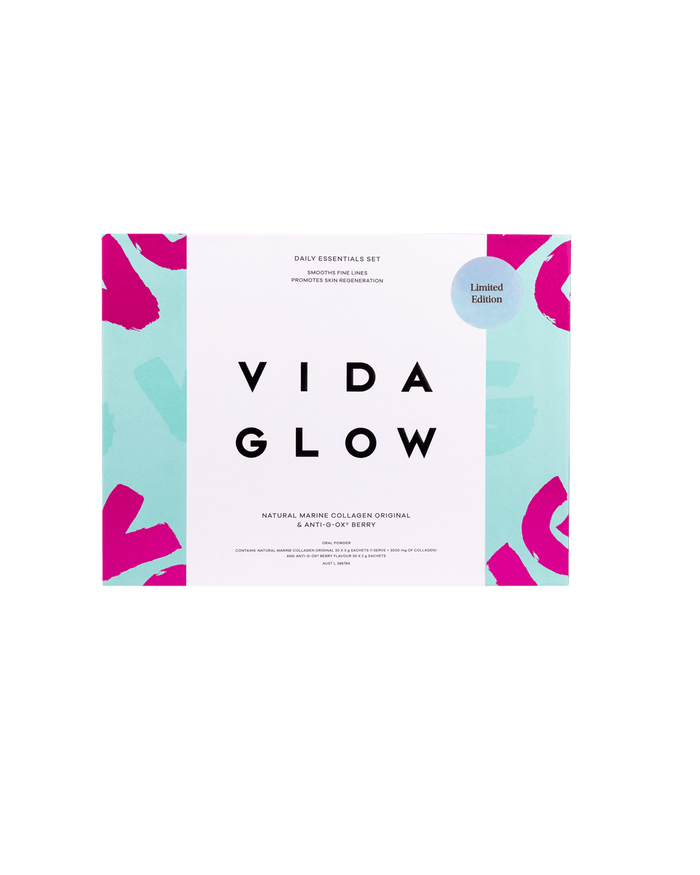 This limited-edition Daily Essentials Set includes 30x Vida Glow Marine Collagen Original 3g Sachets and 30x Vida Glow Marine Collagen Berry Flavour 2g Sachets. The set delivers two supercharged steps to defend and maximize skin's glow this holiday season. Natural Marine Collagen's clinically proven peptides keep the complexion plump and smooth, nails strong and hair thriving.