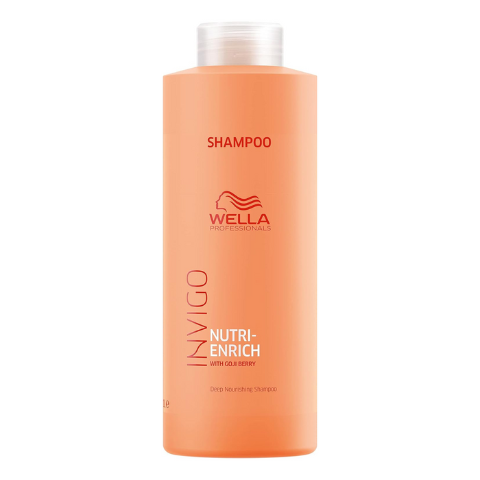 What are the benefits and features of Wella Professionals Invigo Nutri-Enrich Deep Nourishing Shampoo 1000ml?- Nourishes dry or stressed hair, leaving it full of vitality.