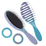 This kit includes a selection of high-quality hair tools designed to make detangling and drying your hair a breeze. The Pro Detangler gently glides through tangles without causing breakage, while the Flex Dry brush speeds up drying time with its open-vented design. Additionally, the two fabric-wrapped coils provide a secure and comfortable hold for any hairstyle. Perfect for all hair types, this kit ensures your hair remains healthy, shiny, and tangle-free.
